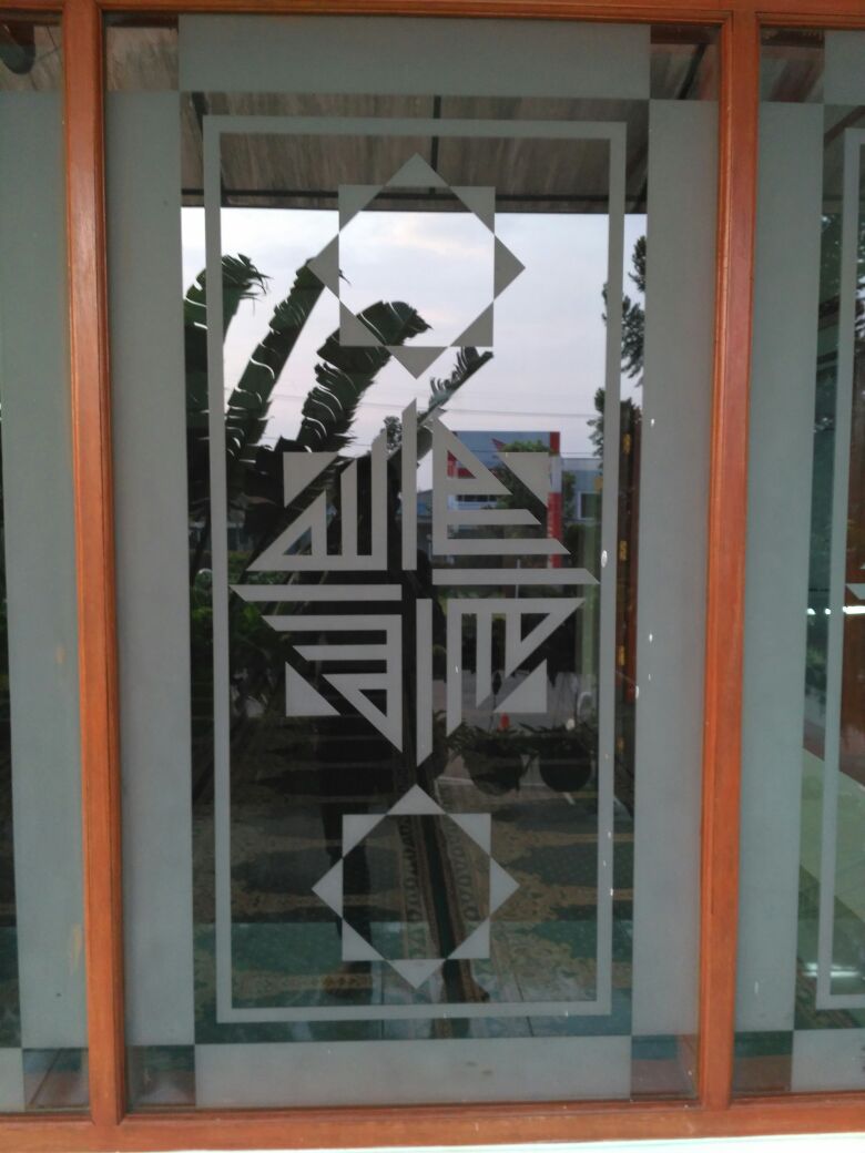 Pemasangan dan pemesanan cutting sticker dan digital printing sticker kaca sandblast polos pemasangan cutting sticker kaca sandblast ornament kalighrafi mesjid.